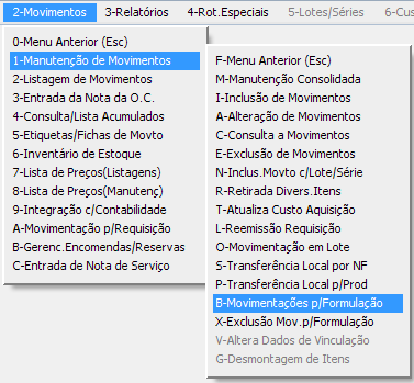 O SIGER® possui um adicional que permite a realização de movimentos de estoque a partir do cadastro de formulações, menu EST 2.1-B.
