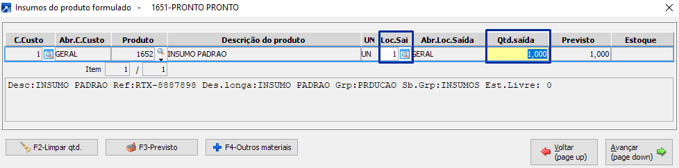 É possível inclusive zerar a quantidade de saída prevista de algum insumo caso seja necessário.