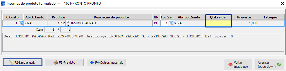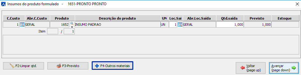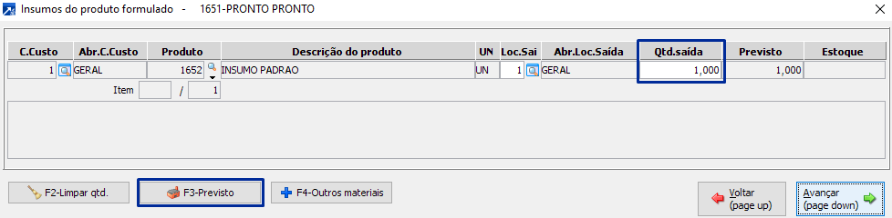 Já o botão <F3-Previsto> zera as quantidades diferentes da prevista (ou seja: distintas daquilo que está informado no cadastro da formulação) que foram editadas. É um "reset" caso o usuário queira "começar novamente" a edição das informações.