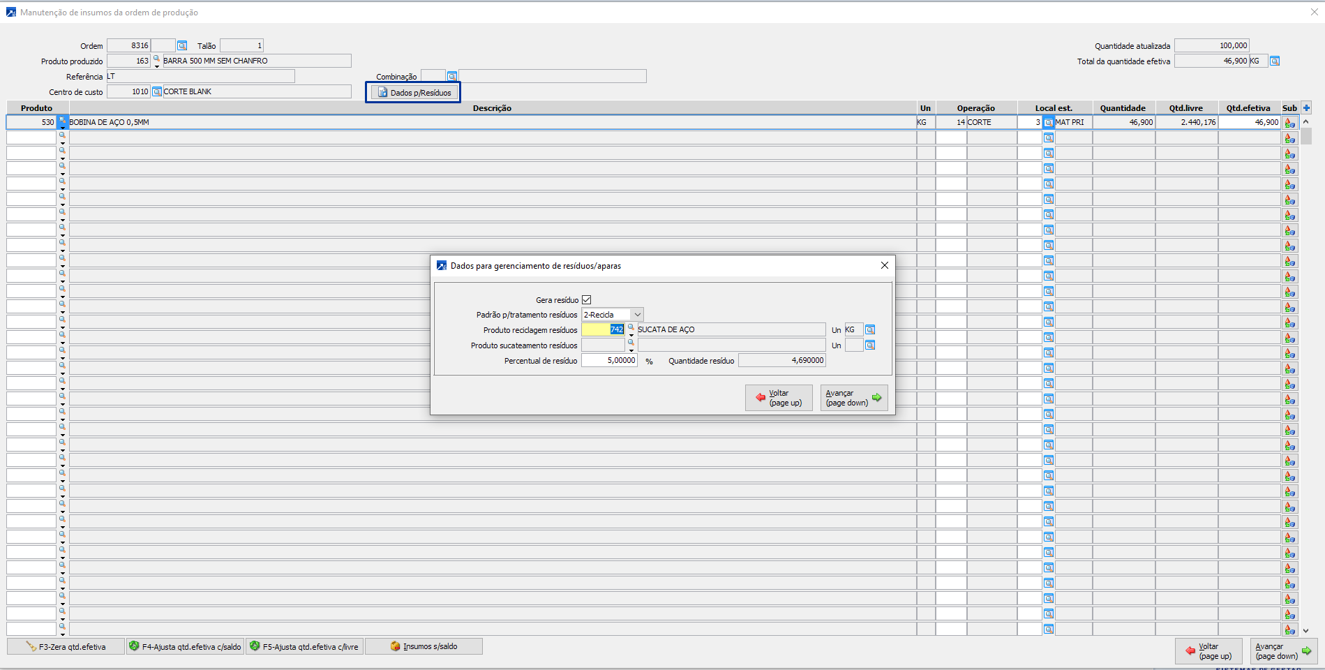 Os movimentos das entradas de sucateamento e reclassicação dos produtos ocorrem de forma automática nos apontamentos da produção, para os produtos com padrões da destinação dos resíduos definidos na formulação.