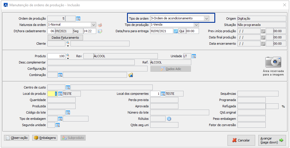 Para produzir o produto acondicionado, é necessário ter saldo em estoque do produto base (que foi previamente produzido), para então realizar o envase do mesmo.