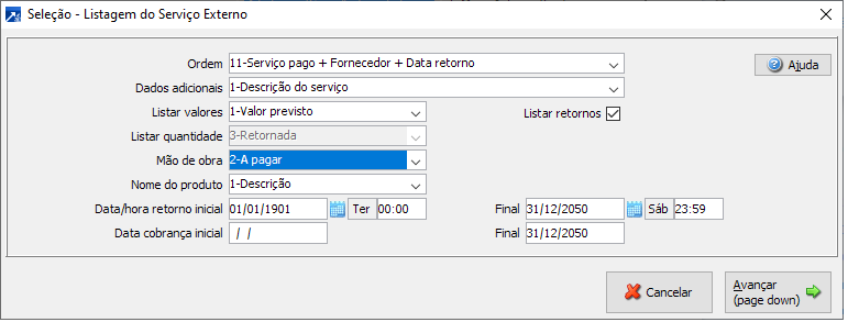 Ao avançar na janela anterior, será aceita a seleção padrão de retornos do serviço externo.