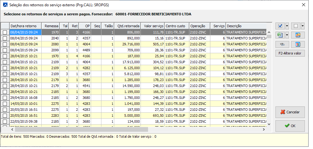Após a confirmação, serão processados todos os retornos do serviço externo do fornecedor que não tiveram pagamento do serviço. Na janela a seguir, é possível selecionar quais os pagamentos serão pagos e definir o valor pago pelo serviço através da função "F2-Altera valor".