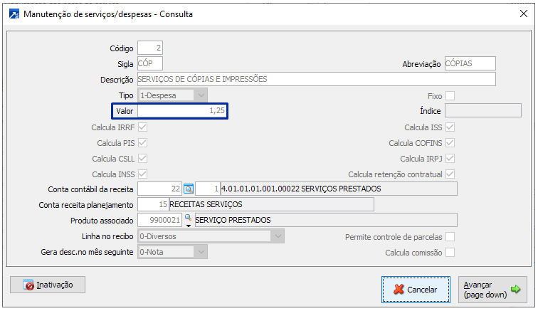Este campo define a utilização de indexadores para cálculo das faturas de serviço, opções disponíveis: