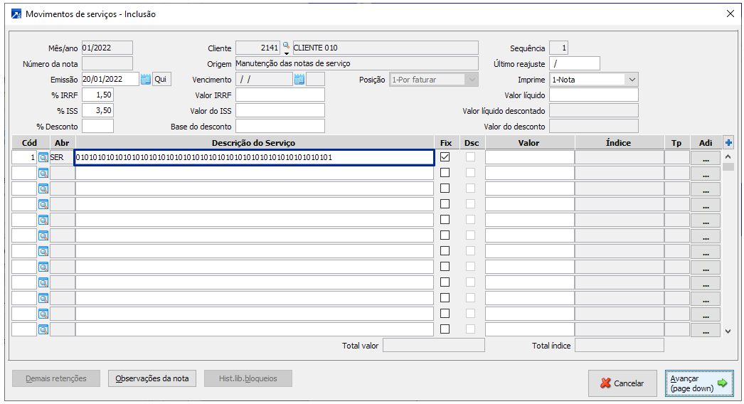 Quando selecionada essa opção, na manutenção dos movimentos de serviços, o SIGER® passa a aceitar a quantidade do índice ao invés do valor do serviço, conforme demonstrado na imagem a seguir, diferentemente da opção 1, não será exibida a janela "Índices para aceitação de serviços", pois será calculado o valor do serviço com base no indexador único previamente configurado no botão <Índices>. A emissão da nota, recibo ou demonstrativo segue o mesmo padrão da opção 1.