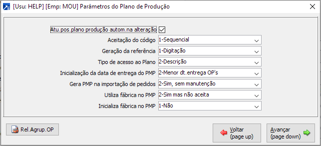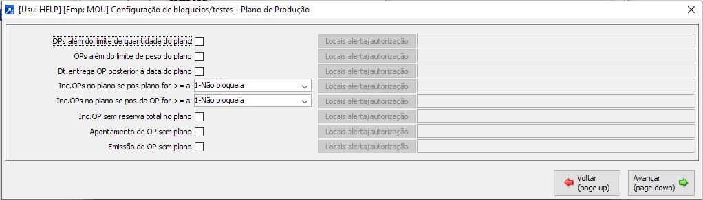 · Inclusão de OPs no plano se posição do plano for >= a: Não permite incluir OPs em planos com posição determinada no parâmetro.