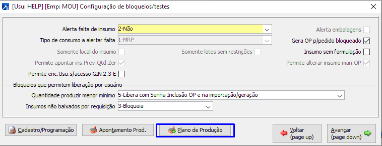 As configurações de aceitação/criação do plano podem ser modificadas no menu GIN 1.2-A, botão “Plano de Produção” (somente habilitado caso tenha sido contratado o adicional). Pode ser configurado o seguinte: