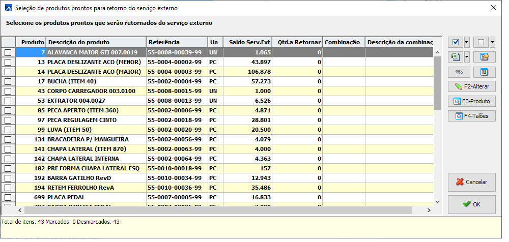 Após aceitar a seleção padrão, as ordens de produção são processadas e os produtos prontos que possuem saldo a retornar no serviço externo, são relacionados e aceitos para seleção conforme a janela abaixo.