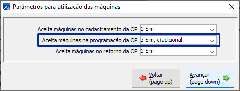 GIN 1.2-A, botão <Aceitações p/Cadastro>, botão <Máquinas>, campo "Aceita máquinas na programação da OP" para a opção "3-Sim, c/adicional"