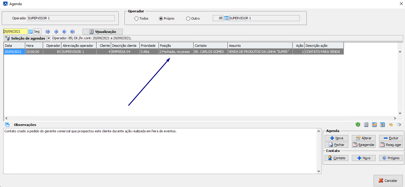 Situação prática: Agenda criada para o operador "João Silva" dar retorno.