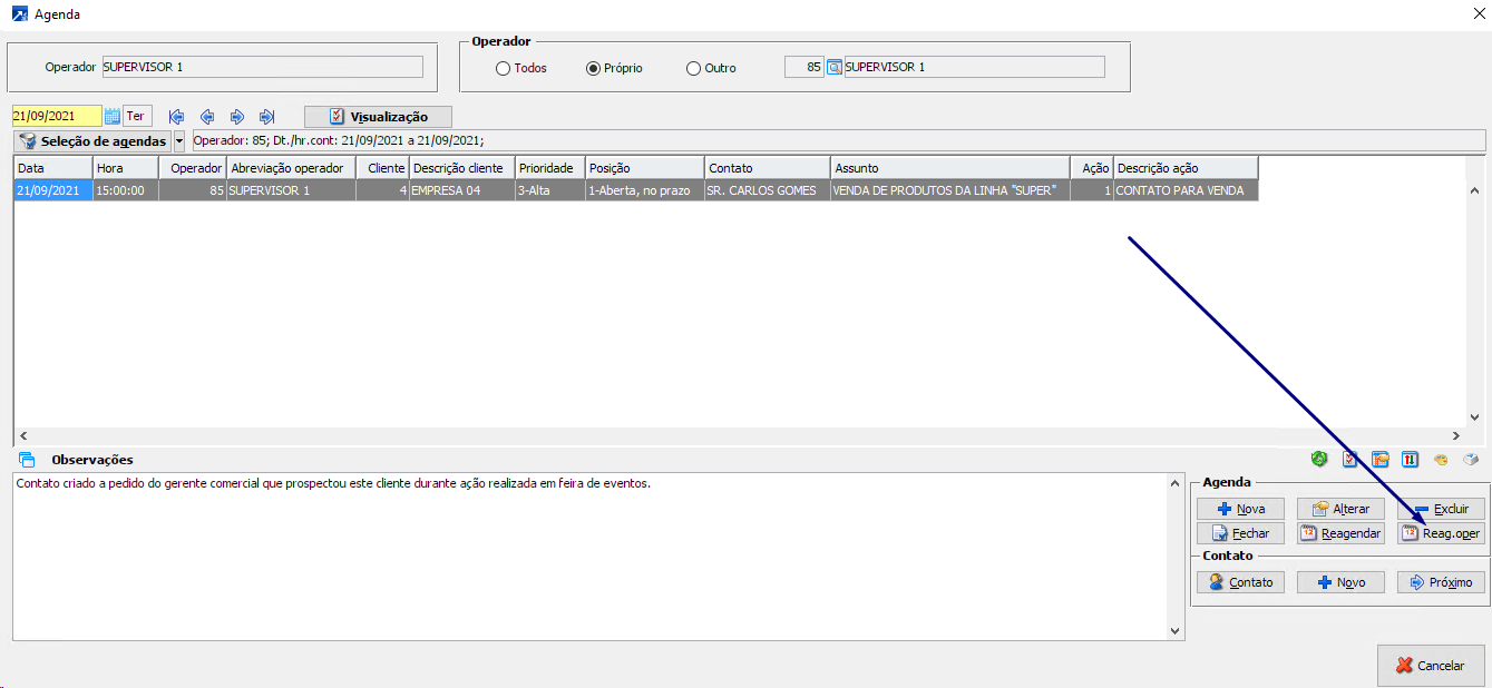 Exemplo: Neste caso será reagendado a ligação para ser realizada dia 22/09/2021 as 15 pelo operador João