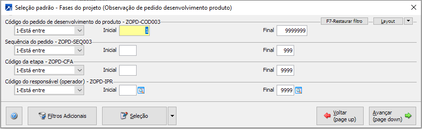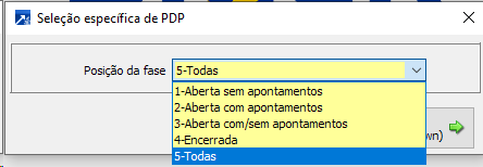 Ao acessar o relatório o SIGER® irá abrir a seleção especifica do PDP, permitindo ao usuário filtrar a posição das fases do PDP:
