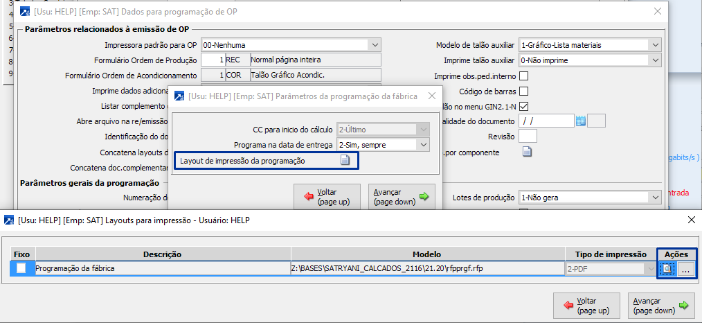 Na opção de menu GIN 1.2-A- Alteração de empresa, é possível selecionar e utilizar o layout padrão do sistema ou configurar um novo layout personalizado para a programação da fábrica: