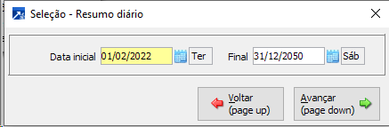 Lista um resumo diário de apontamentos de fases do período informado agrupando por data, na primeira janela o SIGER® irá solicitar o periodo que o usuário deseja filtrar no seu relatório.