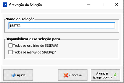 -Todos os menus do SIGER®: Se esse mesmo layout pode ser usado em outros menus do SIGER® que utilizam a mesma tabela para processamento. Quando desmarcado, aparece apenas no menu de sua criação.