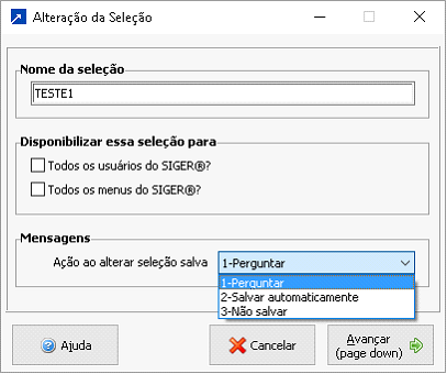 - Perguntar: Sempre irá abrir a mensagem ao fazer alguma alteração da seleção e avançar.