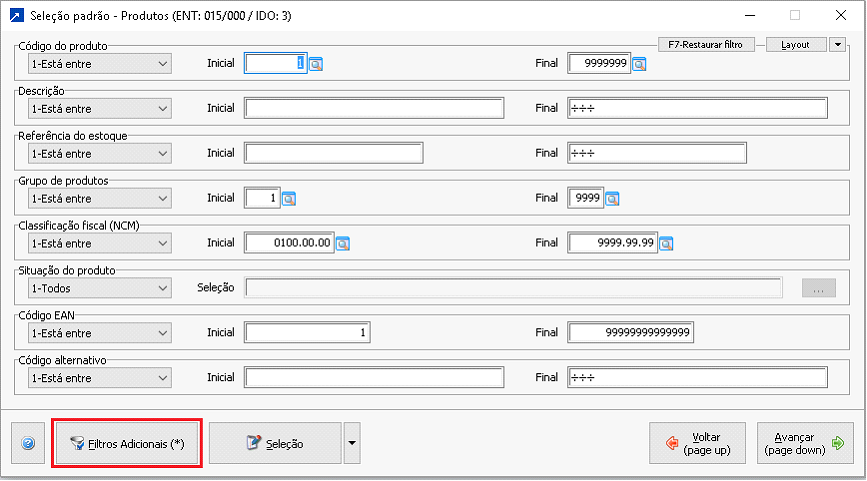 É a função F7 em cada um dos campos, e a opção ’Limpar Seleção’ do extensor de ‘Seleção’