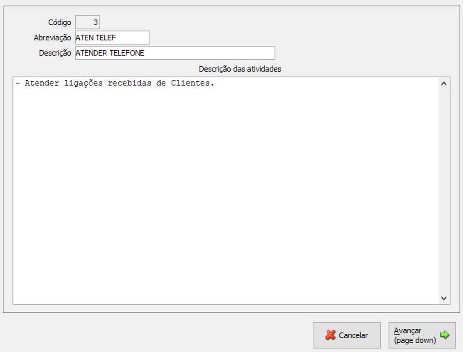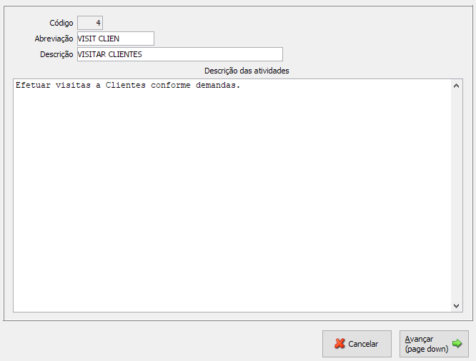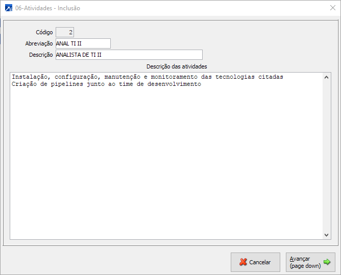 No campo código, pressionar F4 + ENTER , preencher a abreviação e nome da atividade que pode ser o mesmo nome do cargos e no campo abaixo fazer breve descrição da atividade/função, iniciar com o verbo no tempo infinitivo, exemplo: realizar, trabalhar, executar, etc. Esta atividade, no caso poderá ser vinculada apenas no proprio cargo ou no funcionário na aba profissionais 2 para atender demandas do RHU, especificas de SST ( Saude e Segurança do Trabalho ).
