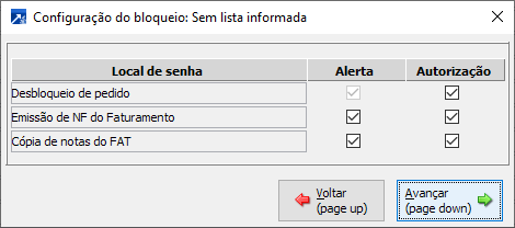 Locais de exibição da mensagem de alerta e/ou solicitação de senha (autorização)