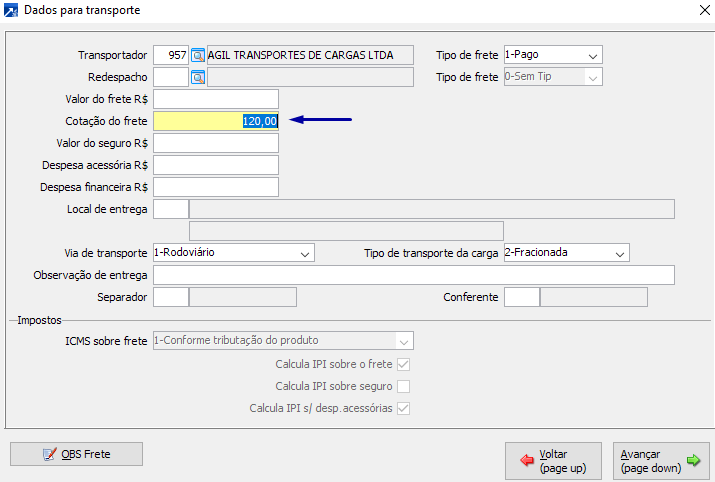 Isto equivale a dizer que quando o SIGER® for buscar as tabelas de preço de frete para compor o valor cotado no pedido, ele irá ter como "chave principal" para busca o código da transportadora cadastrada através do TLO 1.4-I