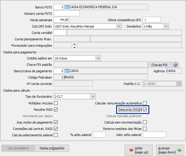 Alguns prestadores de serviço, precisam recolher junto na RPA o ISSQN - Imposto Sobre Serviços de Qualquer Natureza, est tributo é municipal. No SIGER®, para gerar o RPA com desconto do ISSQN, precisa ser feita a configuração no cadastro do autônomo, menu FPA 1.8-A, botão <Cálculo e Pagto> e marcar a check box "Desconta ISSQN".
