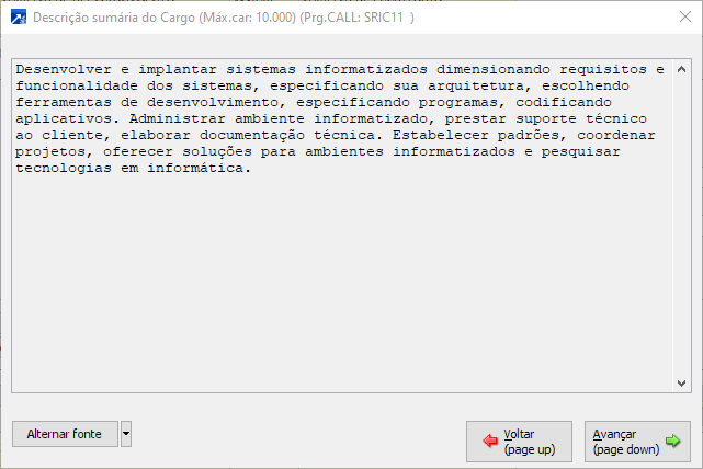 Ao clicar no botão < Descrição sumária > , vai abrir uma nova tela onde deve ser incluida a descrição sumária, bem resumida, compacta do cargo. Esta descrição servirá para recrutamento e seleção, cargos e salarios e Saúde ocupacional. Veja a seguir um exemplo do preenchimento de cada aba datela acima.