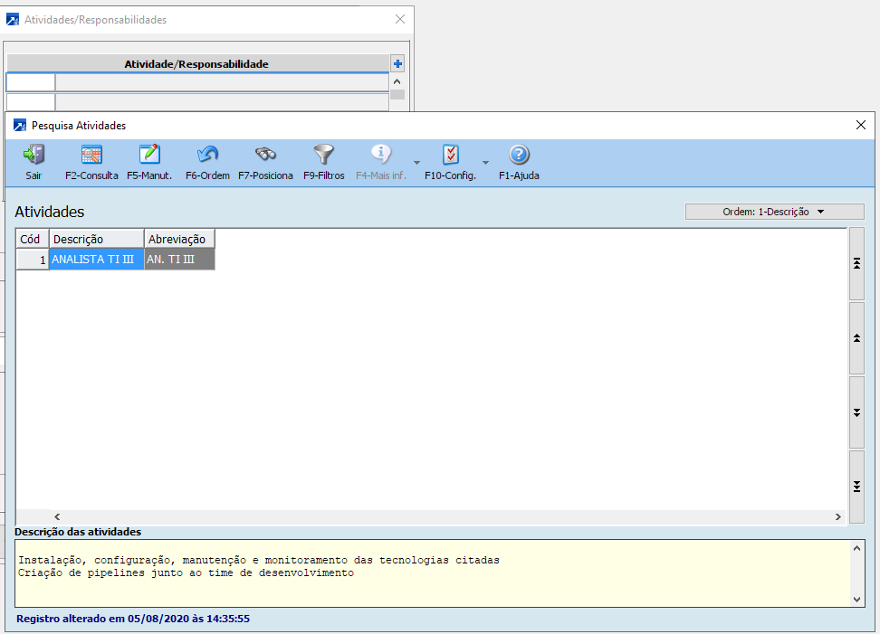 Na primeira linha das atividades clica F8 e vai abrir todas as opções de atividades que foram cadastradas, aí deve ser selecionadas as pertinentes a este cargo somente. Neste exemplo foi incluida uma atividade somente, em forma de texto, mas também poderia ter sido desmembrado em varios itens individuais. Caso a atividade ainda não está cadastrada no SIGER®, pode clicar F8, F5, F4 para achar o proximo número vago e cadastrar a atividade e depois selecionar a mesma no referido cargo.