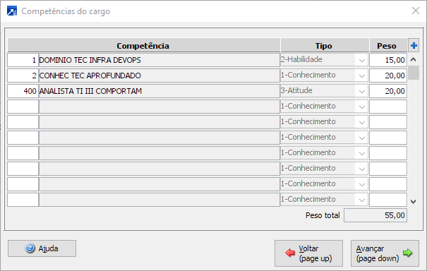 Observação importante: se optares pelos pesos a soma de todos os pesos informados desde a aba comptências até a aba outros requisitos, não pode passar de 100 pontos.