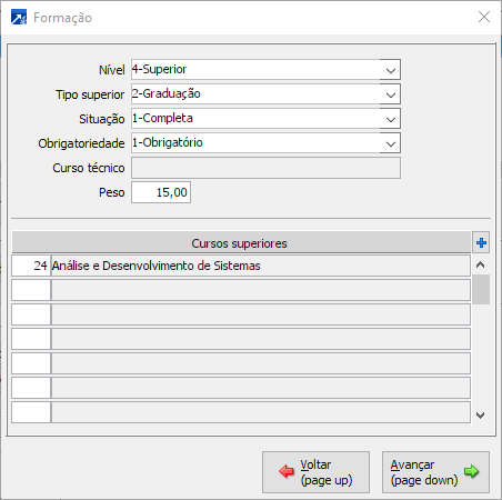 Clicar no botão < Formações > e vai abrir a tela abaixo. Em seguida clicar no botão < incluir > e selecionar a formação desejada para o cargo conforme as telas abaixo. Pode selecionar mais de uma formação.