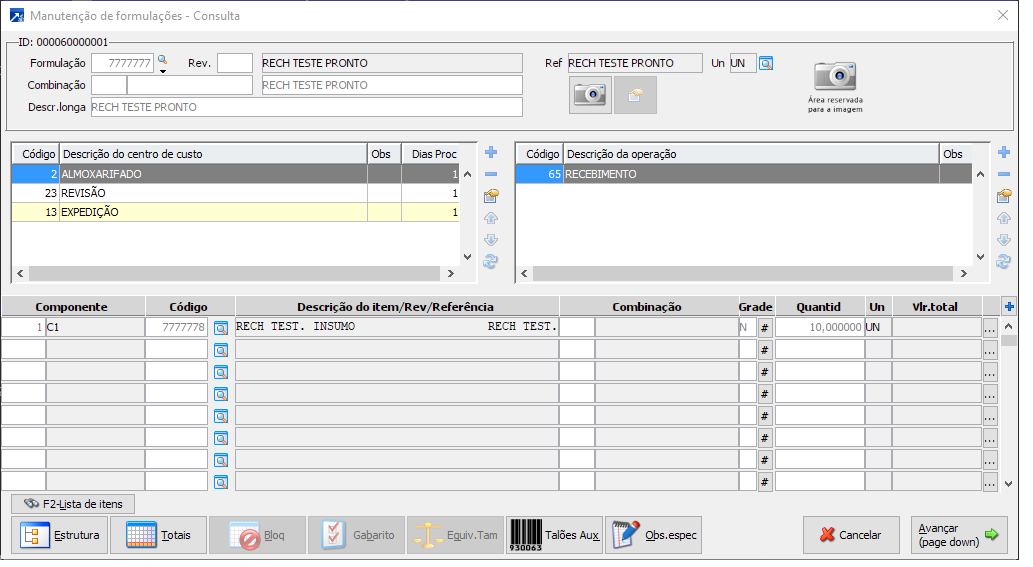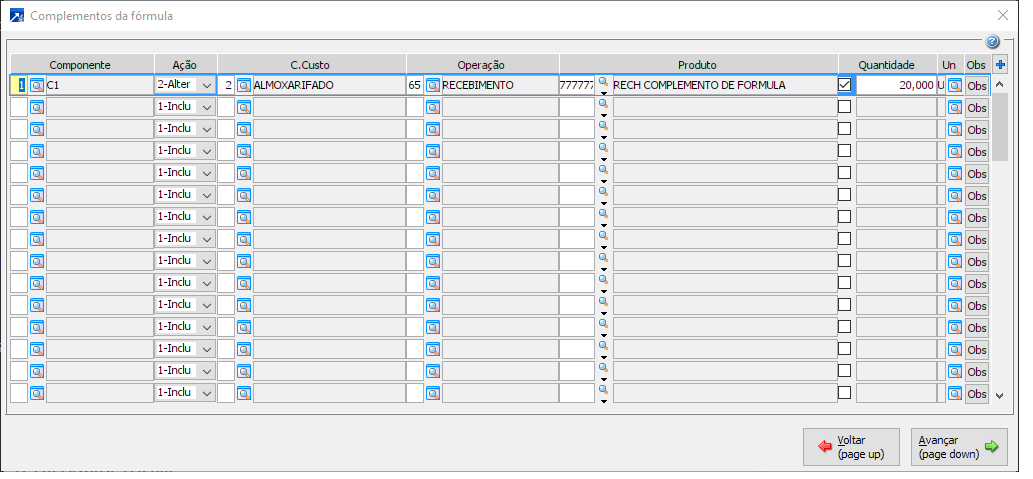 - SE o cliente for o de codigo "1313" e item da venda for o "7777777 ", deverá alterar SE encontrar na formulação o Componente de código "1", no CC 2-ALMOXARIFADO e operação 65-RECEBIMENTO, o insumo atual pelo 7777778 - RECH COMPLEMENTO DE FORMULA com quantidade 20un.