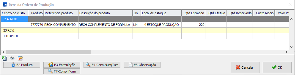 Com a condição e ação proposta acima, no momento que é realizada a Importação de Pedidos do Faturamento para a geração de ordens de produção, no exato instante que a OP for "Programada", o resultado será esse nos insumos da OP: