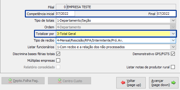 Para listar o relatório do menu FPA 7.8-T é necessário estar S-1299 VALIDADO, informar o período, tipo de totalização e qual agrupamento dos dados.