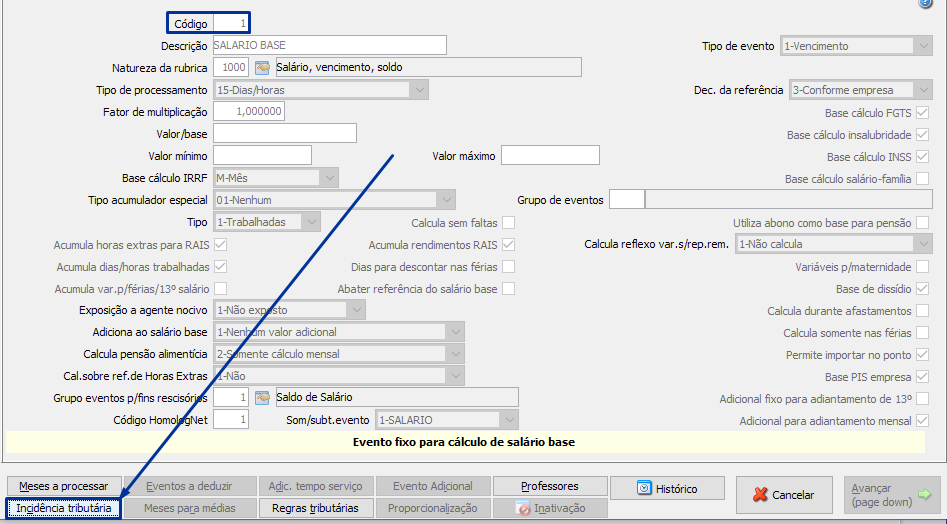 2º Verificar as incidências tributárias com o eSocial. No SIGER®, menu FPA 1.7-C (indicar o código de cada evento) e ir no botão <Incidência tributária>:
