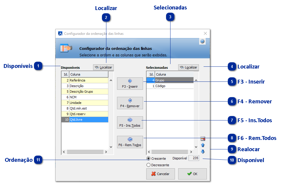Campos disponíveis para configurar ordenação dos registros exibidos.