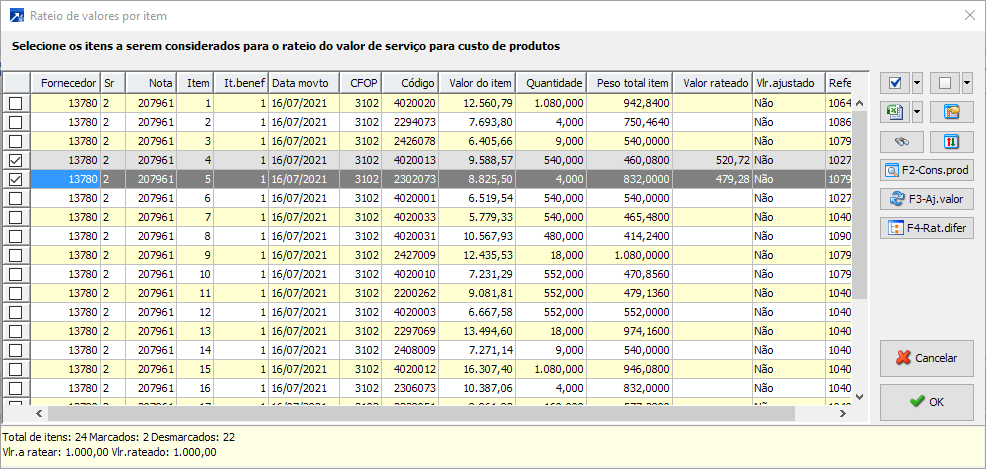 No menu 2.7-I dos Livros Fiscais, ao concluir o lançamento de nota de serviço de fornecedor que esteja configurado para Ratear o valor do custo no estoque, irá abrir uma janela para referenciar em que nota(s) quer ratear esse custo e em seguida, em quais itens.