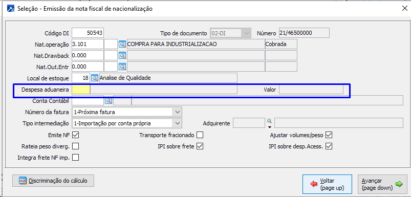 O "Valor Aduaneiro" não é um imposto, mas sim um desembolso na nacionalização. Neste caso, quando marcada esta opção, a despesa será considerada no campo "Despesa Aduaneira" na nota de nacionalização.
