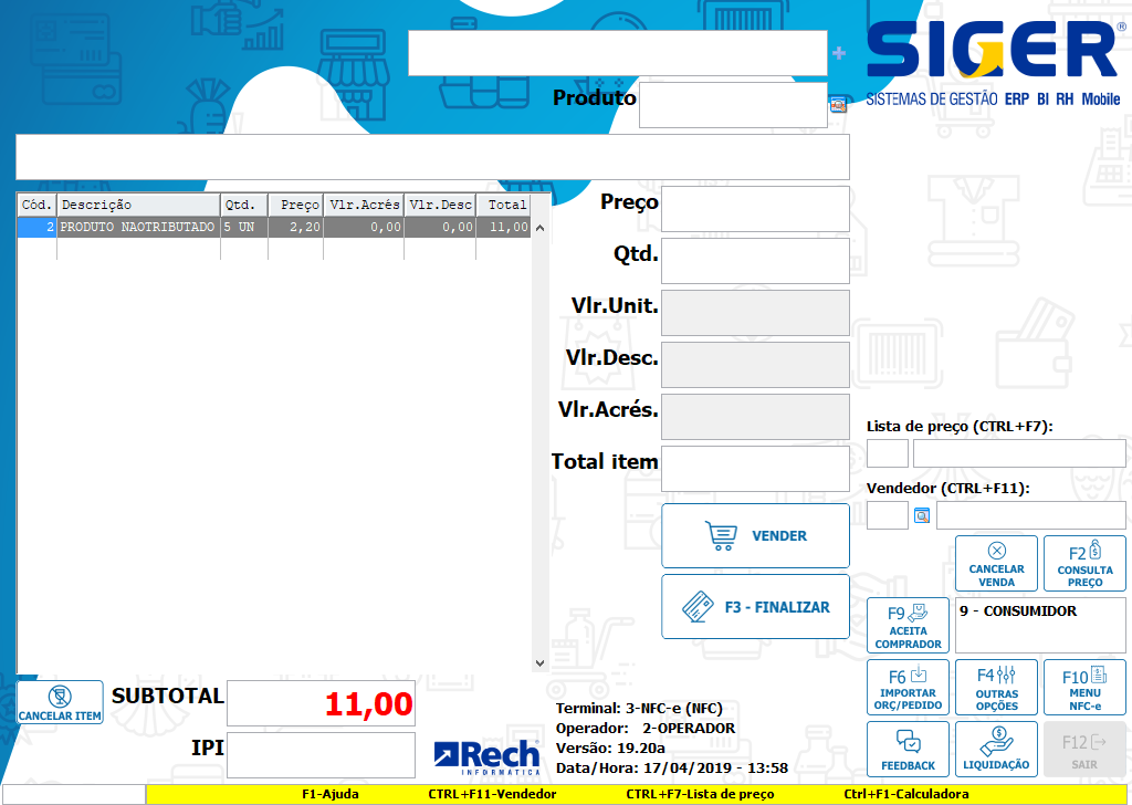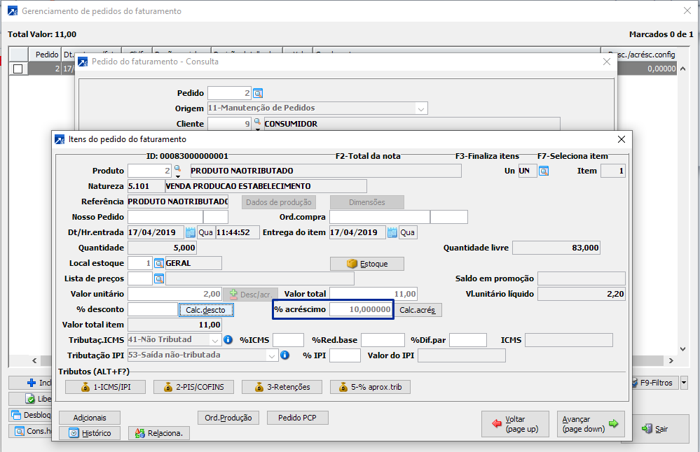 Com um pedido que possui 10 % de acréscimo no item, podemos importar esse pedido no terminal de vendas para emitir uma venda com os produtos deste pedido.