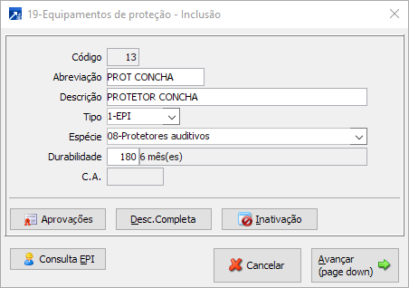 O botão < Descrição completa > da tela do cadastro, serve para complementar o nome do EPI caso o mesmo não cabe no campo Descrição da tela inicial do cadastro do mesmo.