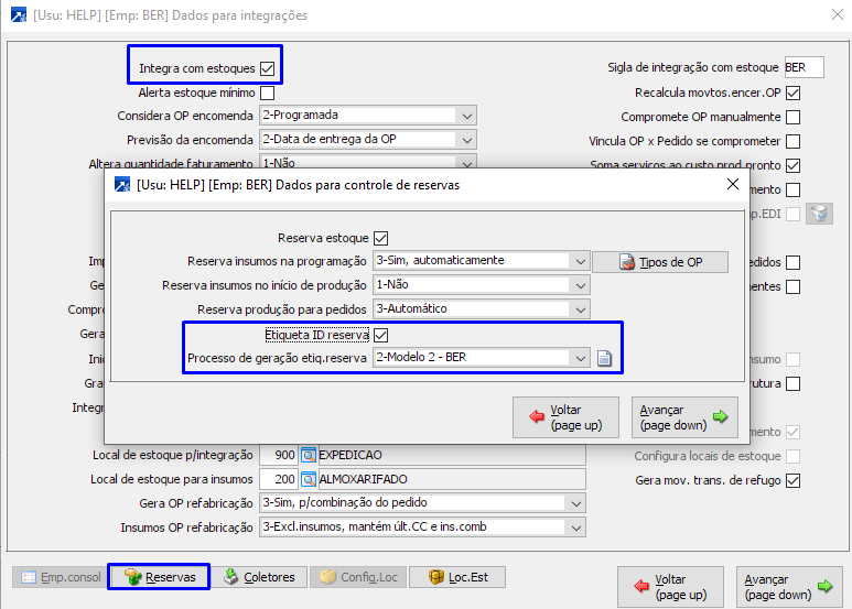 Etiq.Reserva Configurações/Parâmetros
