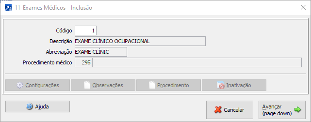 Neste local, cadastrar todos os exames médicos que constam no PCMSO da Empresa para atender demandas da implantação do SST, controle e tarefas ao eSocial. No campo CÓDIGO pressionar F4 + ENTER, nos campos DESCRIÇÃO e ABREVIAÇÃO deve colocar o nome do exame, preencher os demais campos e na aba configurações informar as periodicidades de realização dos mesmos conforme o PCMSO vigente e no botão "regras de periodicidade" o sistema ainda permite informar regras especiais que não podem ser atendidas na tela anterior.