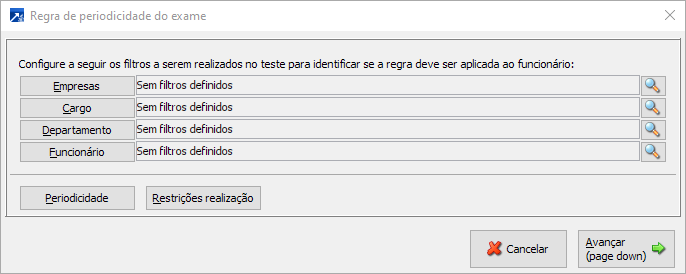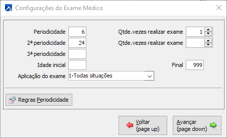 Ainda é possivel informar outras regras de periodicidades especificas para um cargo, depto, setor, idade, etc. Para isso deves clicar na aba "regras de periodicidades" e clicar no botão < incluir > .