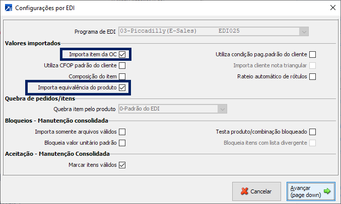 No menu FTR 6.6-G, configurar EDI PICCADILLY (E-SALES) marcando as flags "Importa item da OC" e "Importa equivalência do produto".