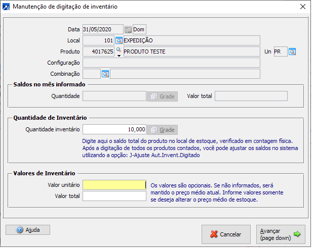 Como os campos de "Valores de Inventário" estão habilitados, o sistema passa a aceitar a digitação de um custo unitário para as quantidades que estão sendo inventariadas.
