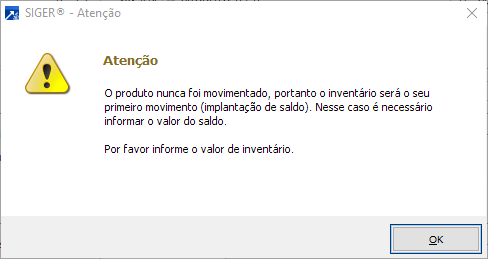Ao tentar digitar inventário para um produto que nunca foi movimentado, o sistema valida a informação e solicita para ao usuário um valor de custo.