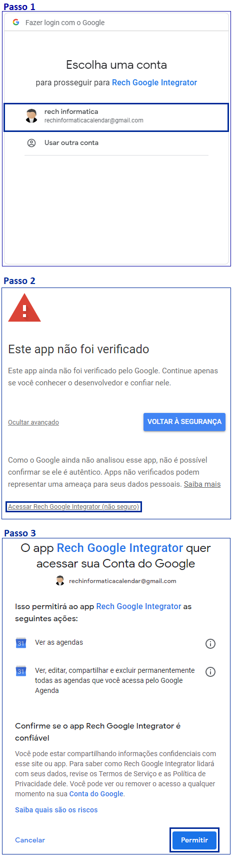O Google reconhece a integração com nome de “Rech Google Integrator” e, somente uma vez, é necessário autorizá-lo para interagir com sua agenda.