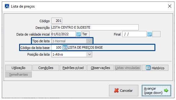 3º Passo: Cadastrar lista de preços normal e vincular a uma lista base