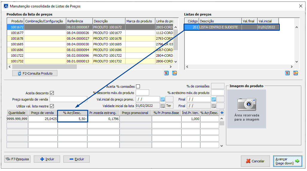 Exemplo da lista de preços vinculada à lista base, acessando a manutenção consolidada da lista, menu FAT 2.8-S.