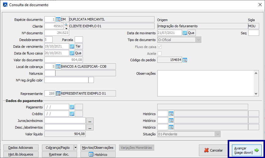 Para conferir/consultar o registro de comissão de uma determinada venda, acessamos a consulta do documento, e avançar até a janela <Consulta consolidada do financeiro>.