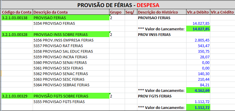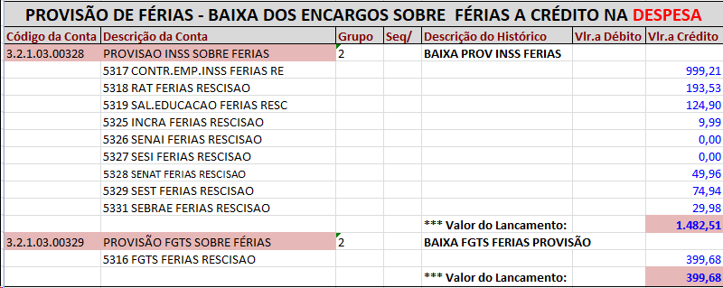 Observação: SOMENTE deverá entornar os valores dos encargos de INSS e FGTS sobre férias pagas em rescisão na conta de provisão na DESPESA no crédito.