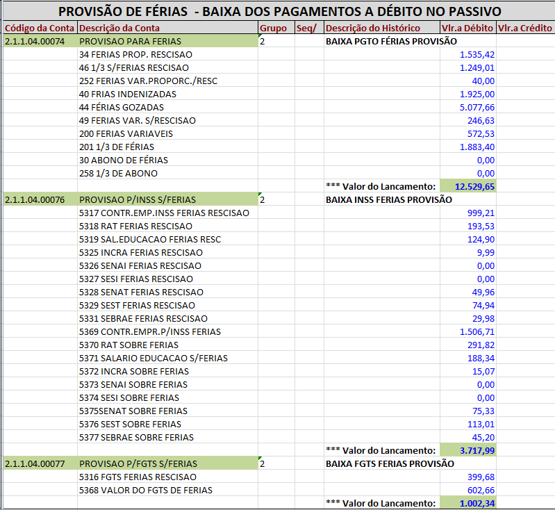 - Quando ocorrer pagamento de férias normais ou pagas em rescisão, deve ser feito o lançamento dos pagamentos nas contas de provisão do passivo a débito, referente aos pagamentos, os encargos de INSS e FGTS.
